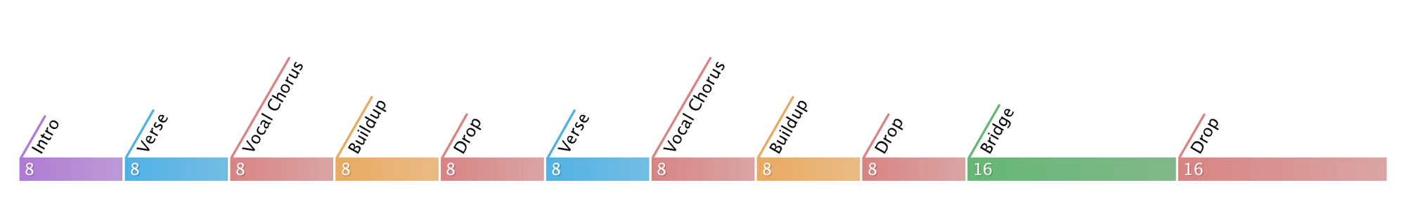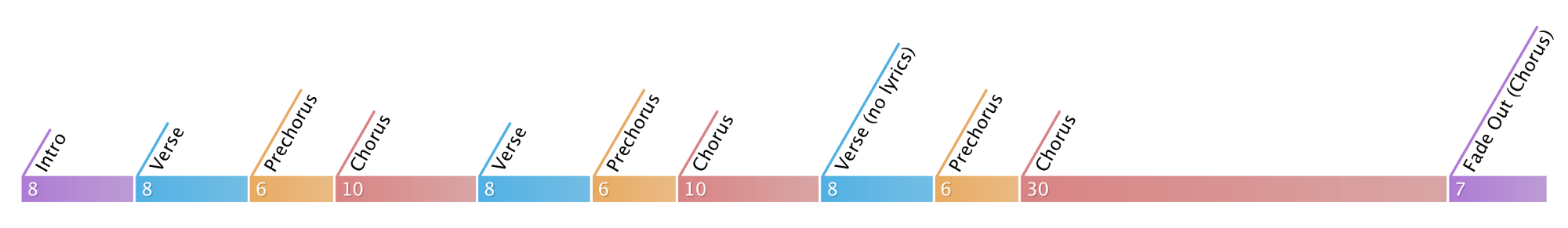This structure is a mix of pop and dance songforms, and we essentially get 2 separate choruses: a vocal chorus, and the drop (which functions more like a traditional chorus, but is largely instrumental). Like most radio-friendly EDM, the sections are delineated primarily by production features and the vocal phrasing rather than discrete harmonic changes.