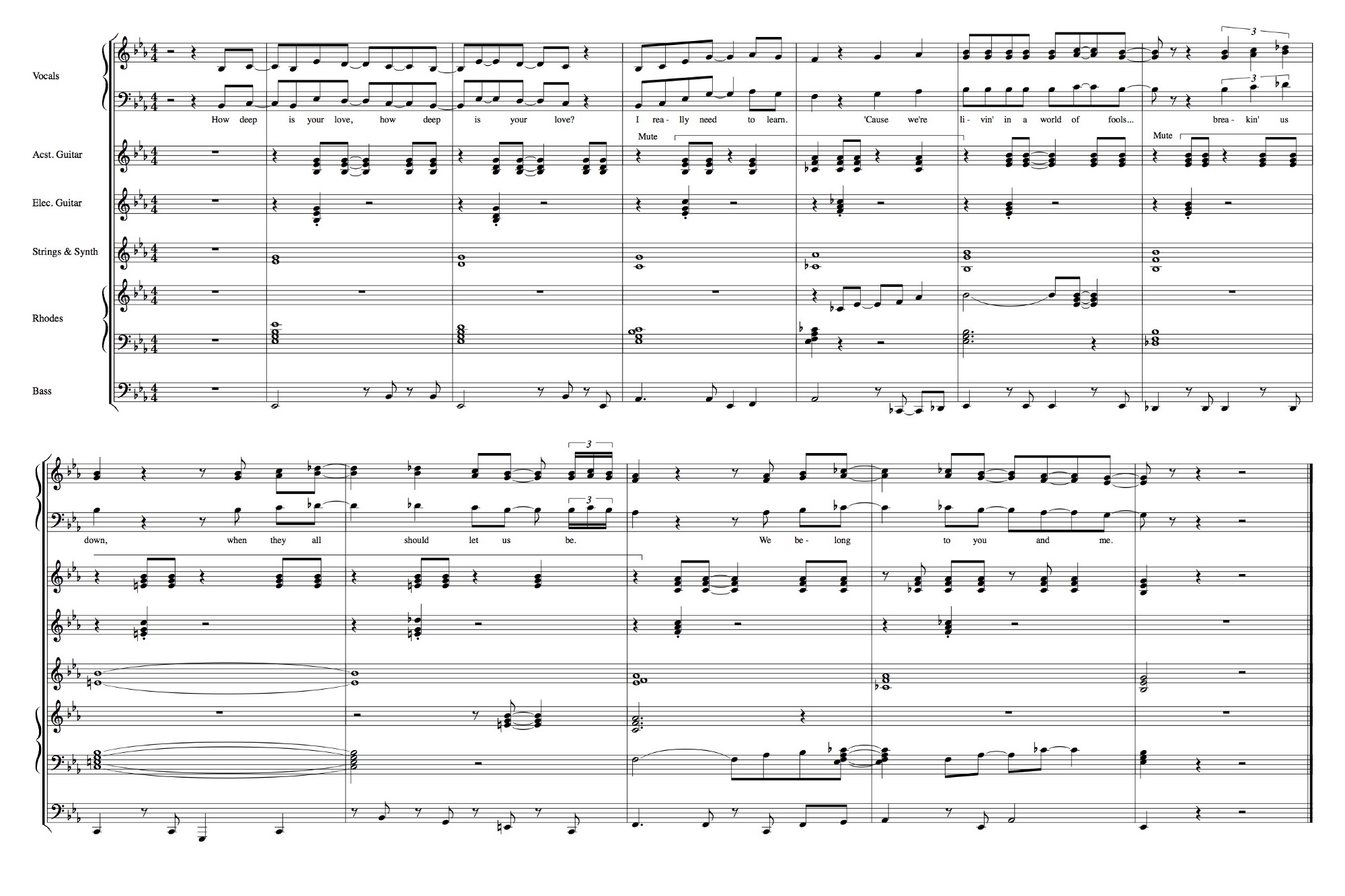 This song is anchored by a luscious rhodes piano (with full-on 70s phaser) and a standard rhythm section; but the instrumentation builds over time, eventually involving both acoustic and electric guitars, strings, an acoustic piano, and subtle synth pads; all topped with an army of breathy overdubbed vocals. To give you an idea of how thick this arrangement is, here’s a chart for the first chorus: