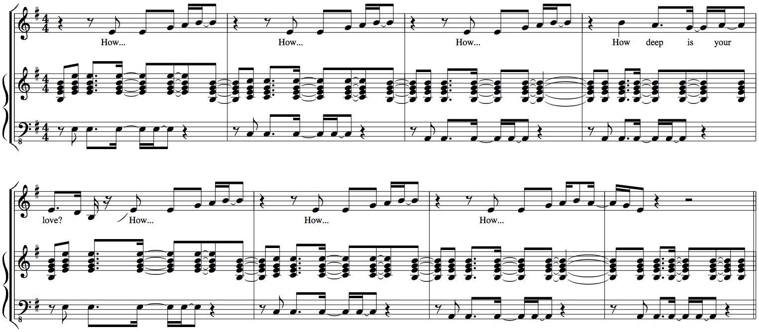 Calvin Harris & Disciples’ “How Deep Is Your Love” is a house-leaning EDM tune featuring vocals from London-based Norwegian vocalist Ina Wroldson. Harris has become one of the most consistently commercially successful EDM producers over the last few years… but like a lot of chart-topping EDM artists, his tracks tend to get major side-eye from critics, who often cite their self-similarity. As a transcriber, I can confirm that these sentiments are basically true from a technical and structural perspective — but this is largely missing the point.⁶