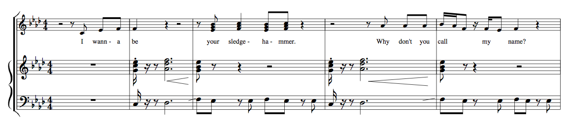 Harmonically, this song mainly sits on Eb7. It’s in the Mixolydian Mode, which was a popular choice for 80s Horn Jams. The chorus moves up stepwise [ Cm > Db > Eb ], and derives a lot of it’s power from the critical rest between the hits on 1 and 2… also note the unusual contrary motion of the vocal part and baseline: