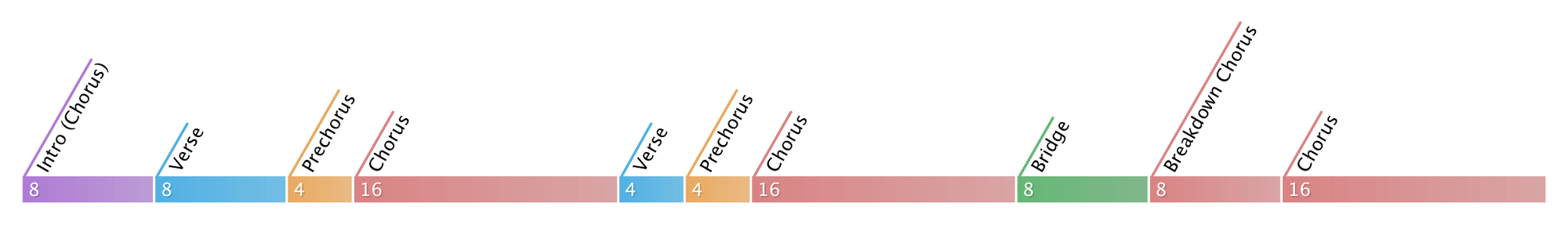Also surprisingly, very little time is actually spent in the choruses. There’s a little false-chorus turnaround between the first two verses, but other than this, the chorus in full only happens twice.